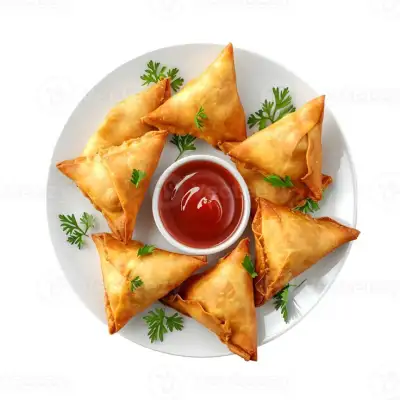 some food is on a plate with ketchup and sauce in the middle for garnishes