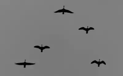 black and white photograph of trees in water with clouds reflected on the ground, while birds fly overhead
