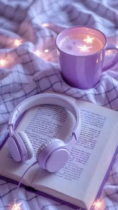 an open book with headphones and a cup of coffee