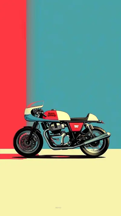 a red and white motorcycle is parked in front of a blue, pink, and yellow wall