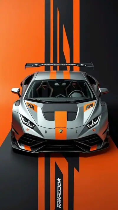 a silver and orange sports car with stripes on it's hood, parked in front of an orange wall