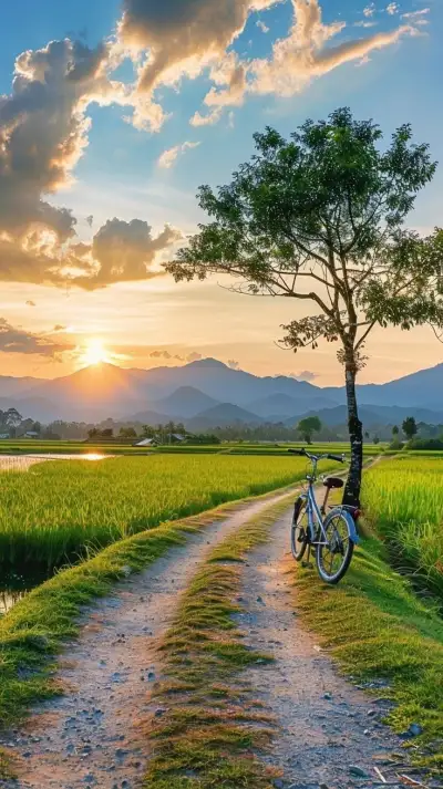 a motorcycle parked next to a campfire under a night sky with stars and clouds