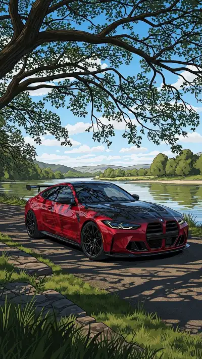 a painting of a car parked in front of a waterfall with a man standing next to it