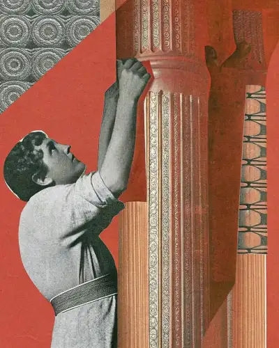 image of biblical story scene of Samson pushing down the...