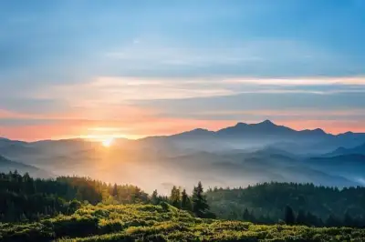 the sun is setting over mountains and trees in the foreground, with fog on the ground