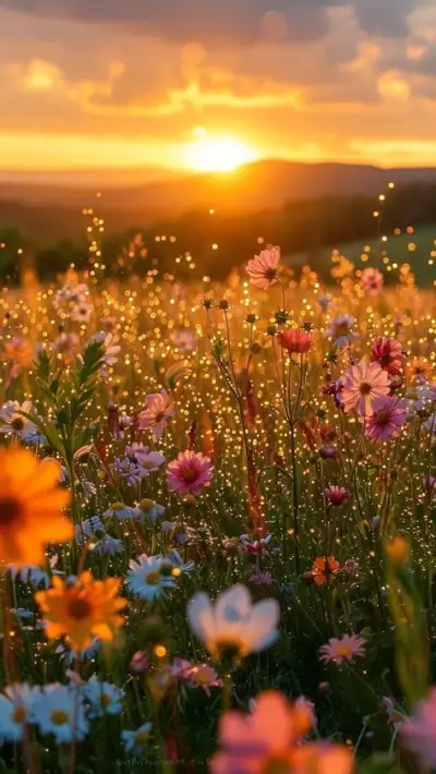 the sun is setting over mountains with wildflowers and trees on either side of the trail