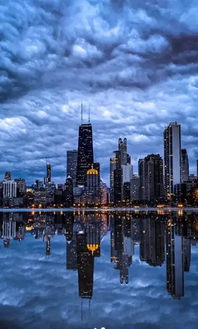 an aerial view of the chicago skyline at night, with skyscrapers in the foreground