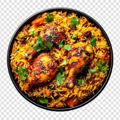 Bowl of biryani with chicken pieces and a lemon top view on transparent background | Premium AI-generated PSD