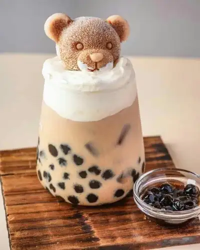 a teddy bear sitting on top of a drink in a cup with whipped cream and raisins