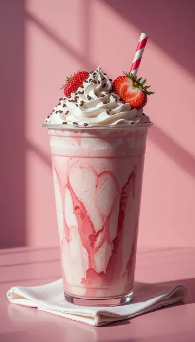 a drink with whipped cream and strawberries in it on a pink table next to a napkin