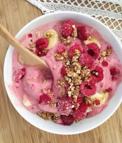 a bowl filled with ice cream and raspberries on top of a wooden table