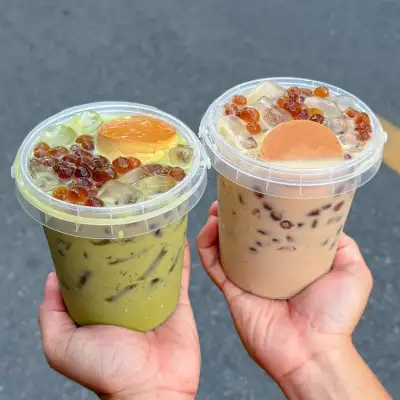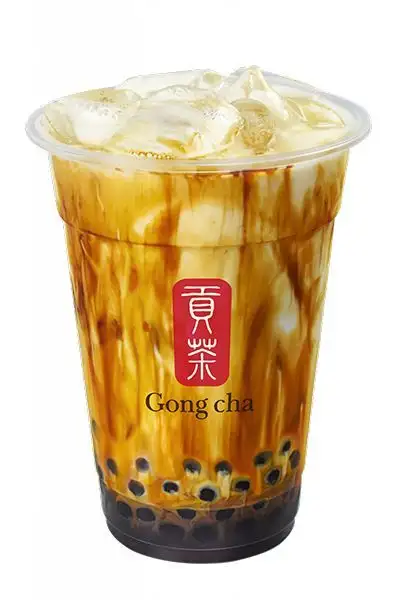 a plastic cup filled with ice cream on top of a white table next to a red sign that says gong cha