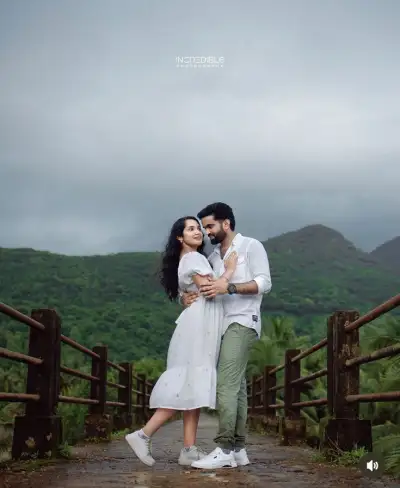 a man and woman standing on a bridge with mountains in the background