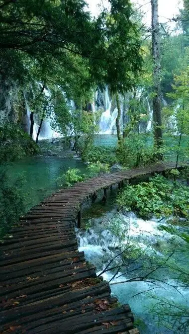 the sun shines brightly over a beautiful waterfall and clear blue water, surrounded by lush green mountains