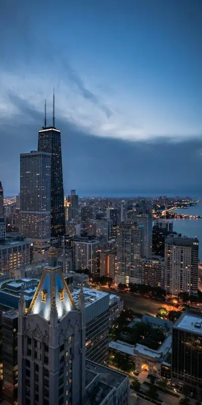 an aerial view of the chicago skyline at dusk