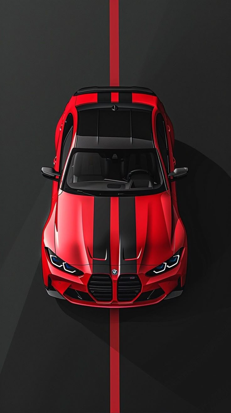 This may contain: an overhead view of a red sports car with black stripes on the front and side