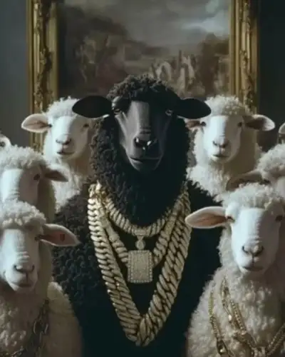 a man standing in front of a flock of birds on a dark background with the moon above him