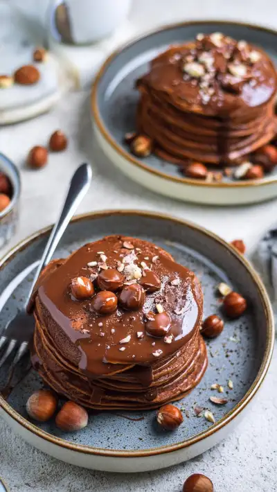 Vegan Chocolate Hazelnut Pancakes with Chocolate Ganache | Thick, Fluffy, and Gluten-Free Recipe