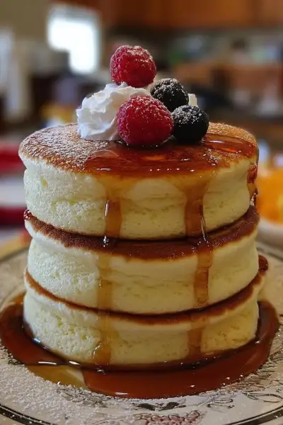🥞✨ Fluffy Japanese Soufflé Pancakes: The Ultimate Brunch Treat! ✨🥞 Look at these gorgeous, fluffy Japanese soufflé pancakes—light as air, stacked high, and topped with fresh berries and a dusting of powdered sugar. Perfect for a special breakfast or brun