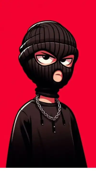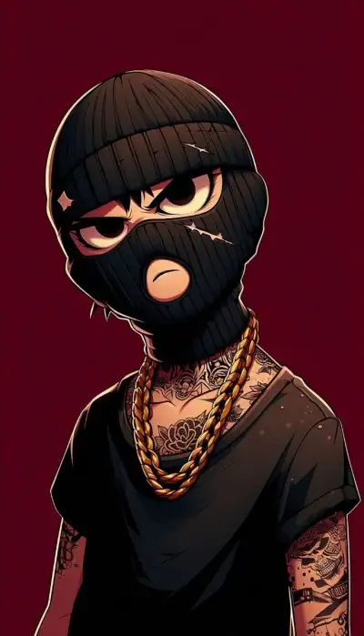a cartoon character wearing a black outfit and chain around his neck with eyes wide open