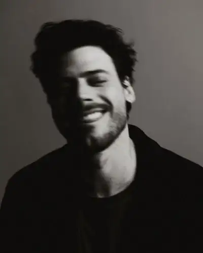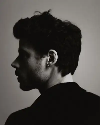 a close up of a person wearing a black shirt and holding his hand to his chin