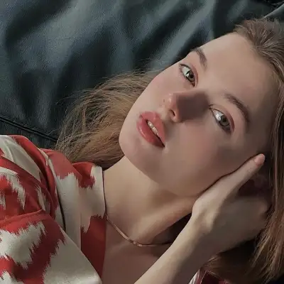 a young woman with blue eyes wearing a black and white sweater looking off into the distance