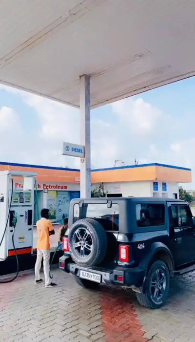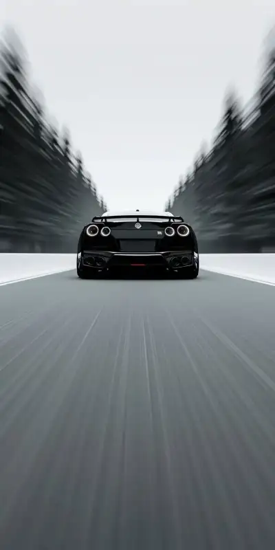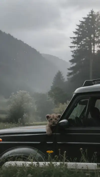 a teddy bear sticking its head out the window of a black car with mountains in the background