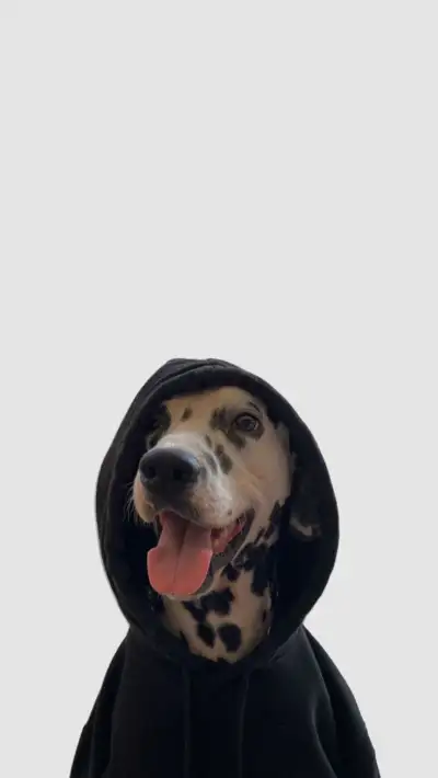 a dalmatian dog wearing a black hoodie with his tongue hanging out to the side