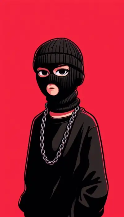 a drawing of a person wearing a black outfit and chain around their neck, standing in front of a red background