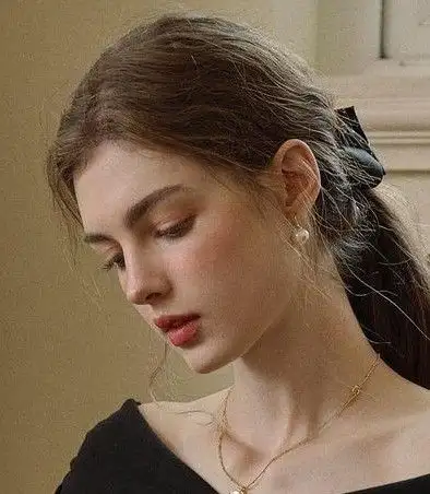 a woman wearing a white blouse with a black bow in her hair is looking off to the side