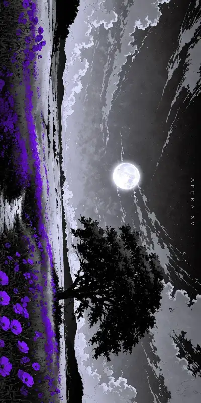 a person standing under a full moon in the sky with pink flowers on it's trees