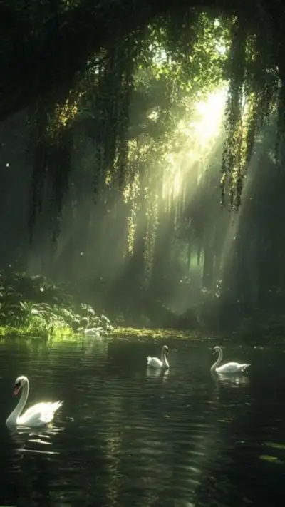 three white swans swimming in the water near trees and sunlight beams shining down on them