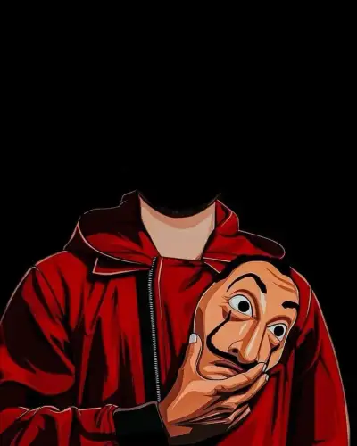 a person wearing a paper mask standing next to a white wall with red circles on it