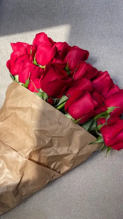 a bunch of red roses in a brown paper bag