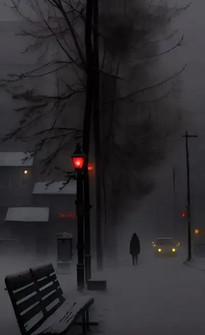 a bench sitting on the side of a snow covered road next to a street light