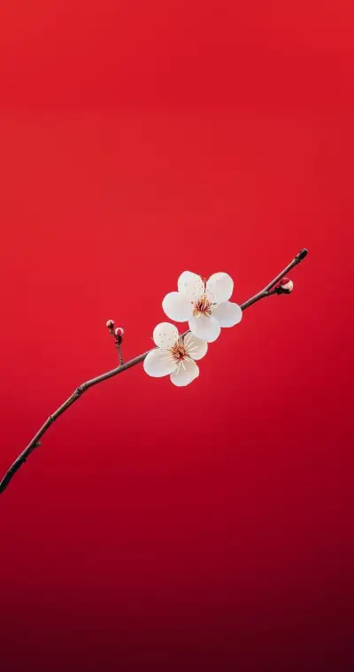 two white flowers are on a branch against a bright red background with copy - space
