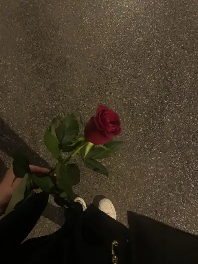 a person holding a red rose in their hand on the ground next to someone's feet