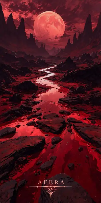 a red full moon over a waterfall in the woods