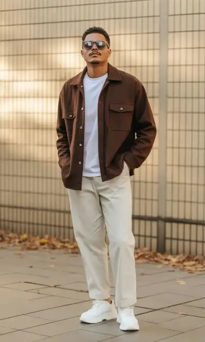 “Men’s Street Style 👕 | Dark Shacket & Beige Chinos Outfit ✨”