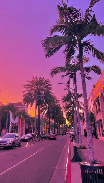 a street with palm trees and buildings in the background at sunset or sunrise, there is no image here to provide a caption for