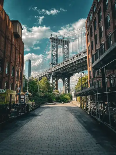 an empty street with buildings and a bridge in the background