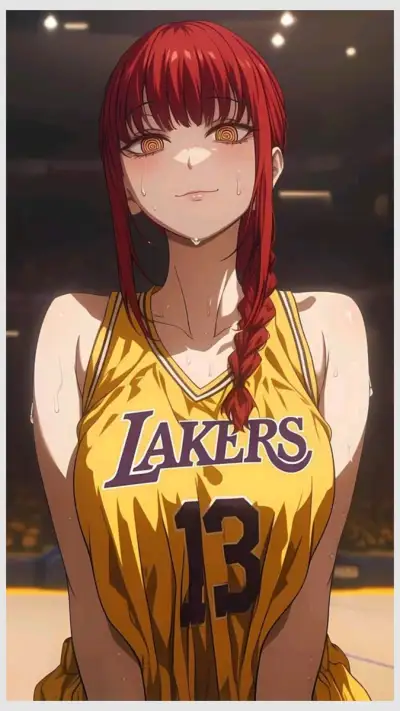an anime character with red hair wearing a lakers jersey