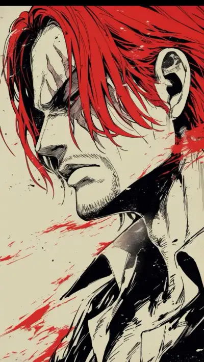 an anime character with red hair and white teeth, holding his hands to his face