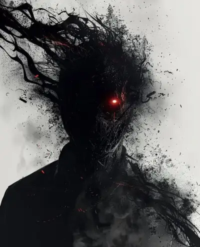a man with red eyes and black hair is shown in front of a white background