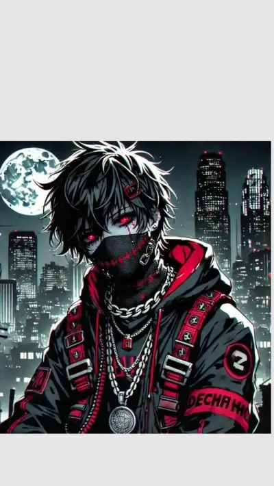 a man in black and red clothes with chains on his face, standing in front of a cityscape