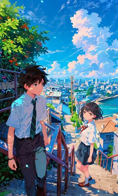 an anime scene with two people standing on stairs and looking at the water in the distance