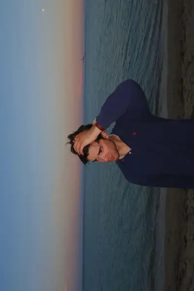 a man standing next to the ocean with his hand on his head