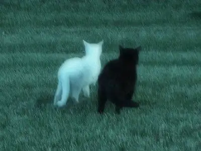 two black and white cats standing in the grass looking at each other with their backs turned