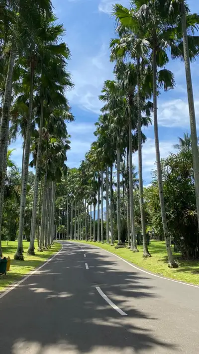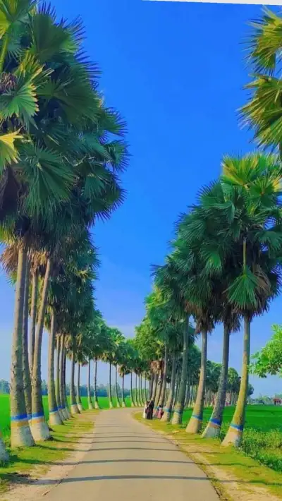 a dirt road in the middle of a lush green field with palm trees on both sides