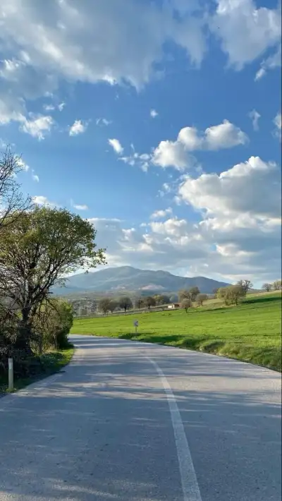 an empty road with trees on both sides and rolling hills in the distance, under a partly cloudy blue sky
